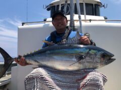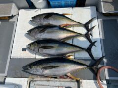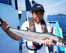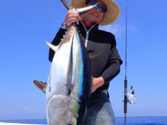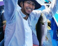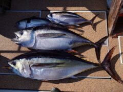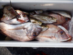 船外機ボートで濱森さんがマダイ、メイチ、コロダイ、シイラ、ソウダカツオをゲット。