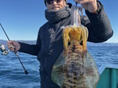 船外機ボートでアオリイカをゲット。