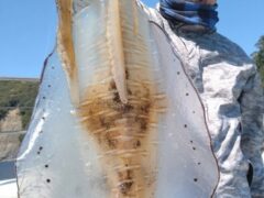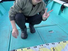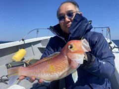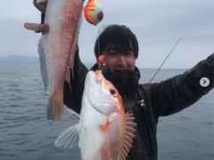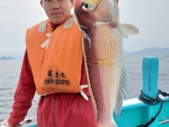 船外機ボートでマダイ77㎝、キビレをゲット。