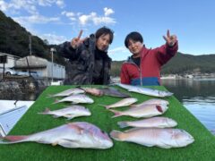 二木島沖釣果 マダイ40~50㎝3匹 チダイ25~35㎝12匹 ハマチ40~45…
