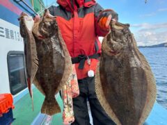 泳がせ釣果 ヒラメ 37〜75㎝ 0〜3枚 計22枚 キジハタ 30〜54㎝ 0…