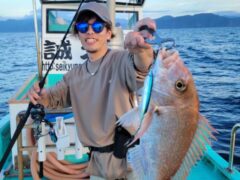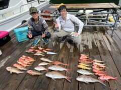 船外機ボートで岡部さんがマダイ、グレ、アカハタ、カワハギをゲット。