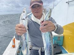 手漕ぎボートで奥川さんがアジ、サバ、カマスをゲット。