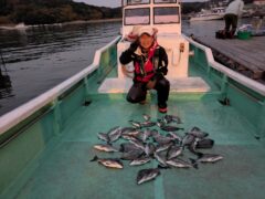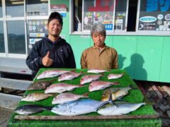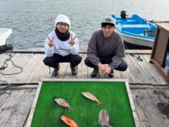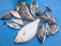 船外機ボートでマダイ、ヤイトカツオ、カワハギツバス、メイチをゲット。