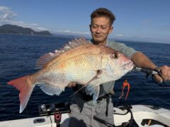レンタルボート釣果 ティップランでアオリイカ胴長25cm頭に2杯、マダイ38cm…