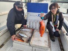 ティップランでコウイカ1杯、アカハタ1匹、メイチダイ1匹。要免許船。