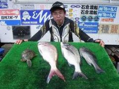 マダイの59センチを1匹、グレの30センチを1匹、カワハギの37-30センチを各…