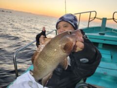 ヤエンでアオリイカ胴長34cm(1.35kg)頭に2杯、オオモンハタ4匹