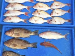 タイラバ釣果 マダイ47cm頭に11匹、オオモンハタ48cm頭に3匹、イトヨリ、…