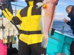天秤仕掛、タイラバ釣果 シロアマはなんとか一つ釣れ紅白達成された方もみえました。