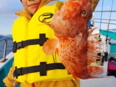 船外機ボートで馬場さんがアカハタ、カサゴをゲット。