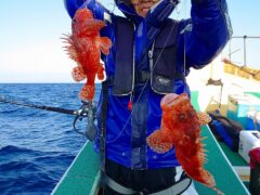 船外機ボートで馬場さんがアカハタ、カサゴをゲット。