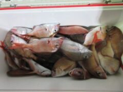 アカハタ41cm頭に12匹、マダイ42cm、カワハギ27cm、ガシラ25cm、オ…