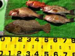カワハギ26cm頭に15匹、アオハタ33cm頭に3匹、オオモンハタ31cm、アカ…
