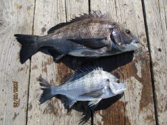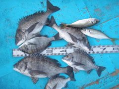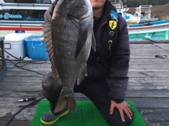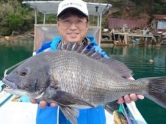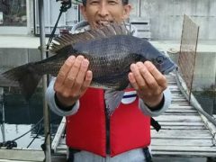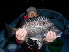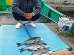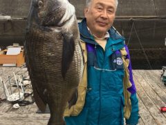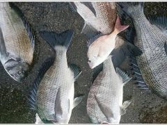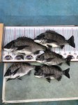 熊崎さん夫婦、黒鯛45センチ頭に5枚、餌はシラサエビ、ボケ
