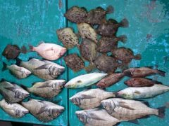 橋本さん達がチヌ頭 35㎝ 9匹、カワハギ 11匹