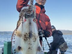 レンタルボート釣果 ティップランでアオリイカ胴長33cm(1.28kg)頭に2杯…