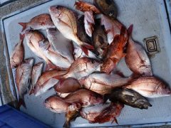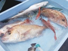 船外機ボートで岡田さんがマダイ40cmまでとハモ、チダイをゲット。