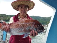 船外機ボートで今津さんがマダイ60cmまでゲット