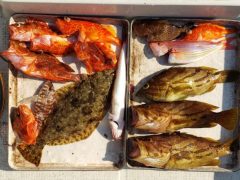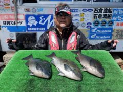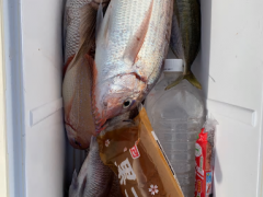 船外機ボートで石原さんがマダイ57cmとホウボウ、アカハタ、オオモンハタをゲット…