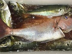 マダイ60㎝1匹 ハマチ48㎝1匹 ガシ12匹 オコゼ8匹