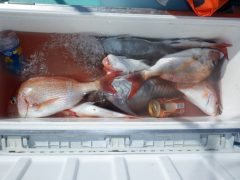 エギでアオリイカ胴長30cm(1.1kg)頭に3杯、アカハタ26cm頭に5匹