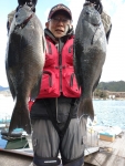 手こぎボートで仁井さん、木下さんがワラサ、アジをゲット