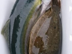 午前便ジギング釣果 平目58cm、ワラサ2尾、真鯛48cm等釣り