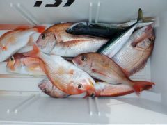 永澤さんらが3人がマダイ45~65㎝15匹 アマダイ2匹 ヨコワ1匹 レンコ6匹