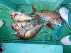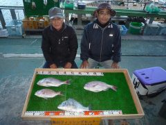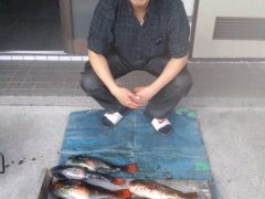 城の猪飼さんら5人が マダイ40~70㎝24匹 メダイ55、60㎝2匹 レンコ2…