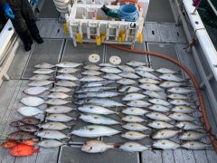 ヒラメ 2枚 ワニゴチ 1本 メバル 1匹 ガシッ 数匹 ハマチ 40本くらい