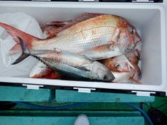 長野のヤマジさんら2組、マダイ45~70㎝8匹 メダイ70㎝1匹 ヨコワ47㎝1…