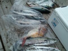 マダイ45~60㎝9匹 ブリ85,90㎝2匹 メダイ55~70㎝19匹 カツオ3…