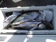 小林さんら4人がマダイ40~60㎝10匹 メジマグロ47~55㎝20匹 本カツオ…