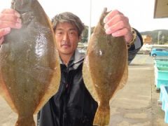 船外機ボートで宮崎さんがヒラメ55cm、ワラサ66cmをゲット。