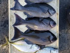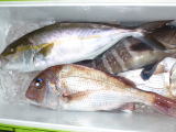 磯釣りで松城さんがイサキ、ツバス、シマアジ、マダイをゲット。