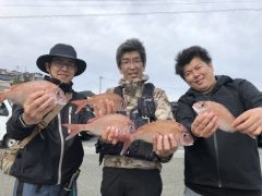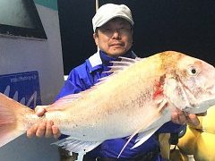 船外機ボートで佐野さんがマダイ、メイチ、オオモンハタをゲット