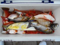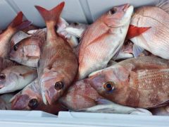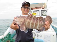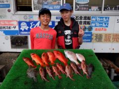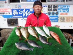 船外機ボートで飯嶋さんがマダイ、カサゴ、アカハタをゲット。