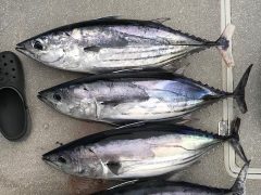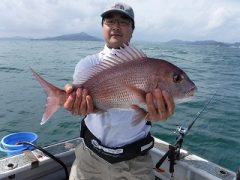 船外機ボートで荒居さんがマダイ、ヘダイ、ウスバ、キビレをゲット。