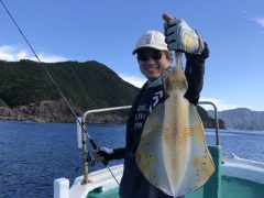 船外機ボートで小木曽さんがオオモンハタ、アオハタをゲット。